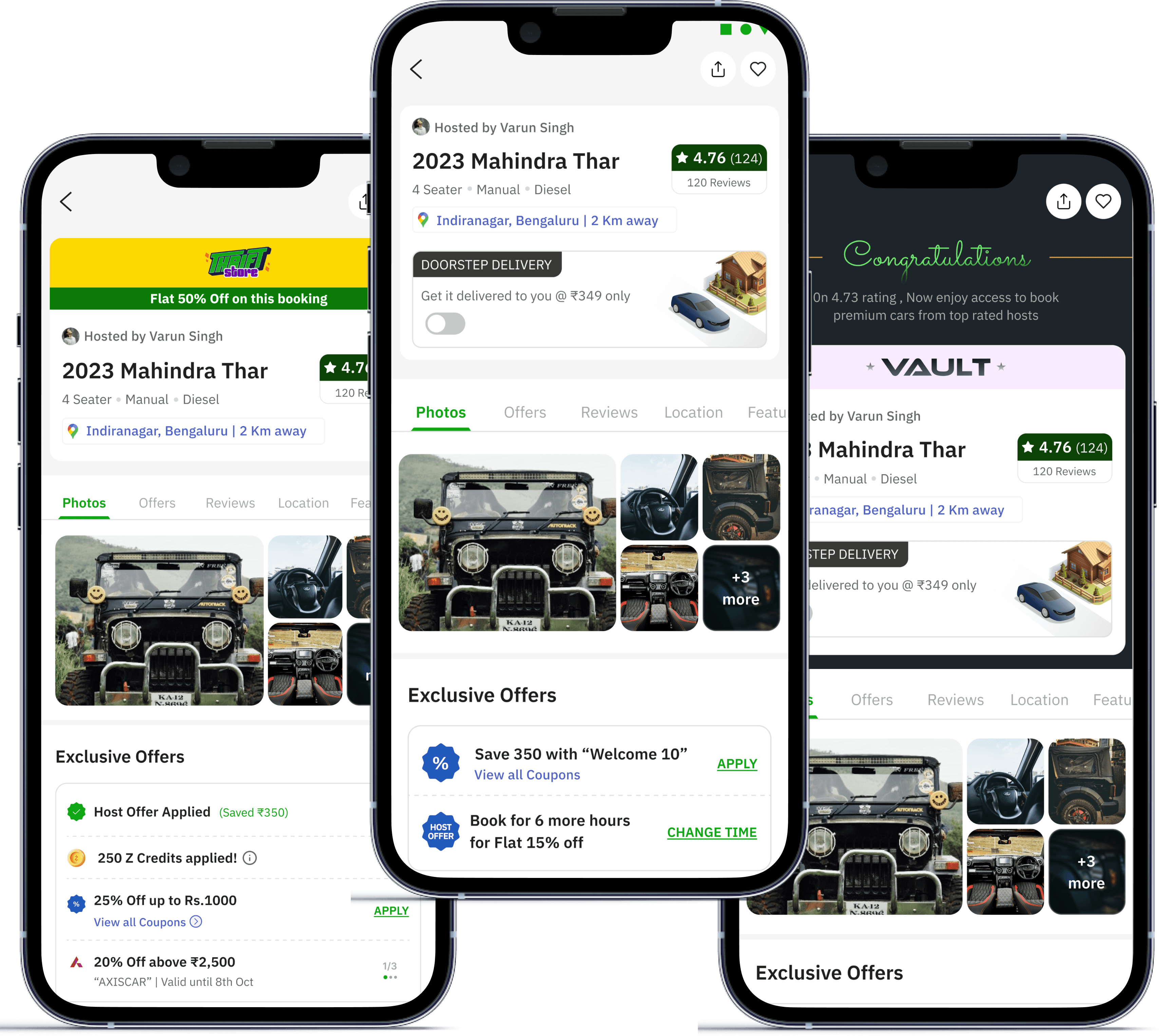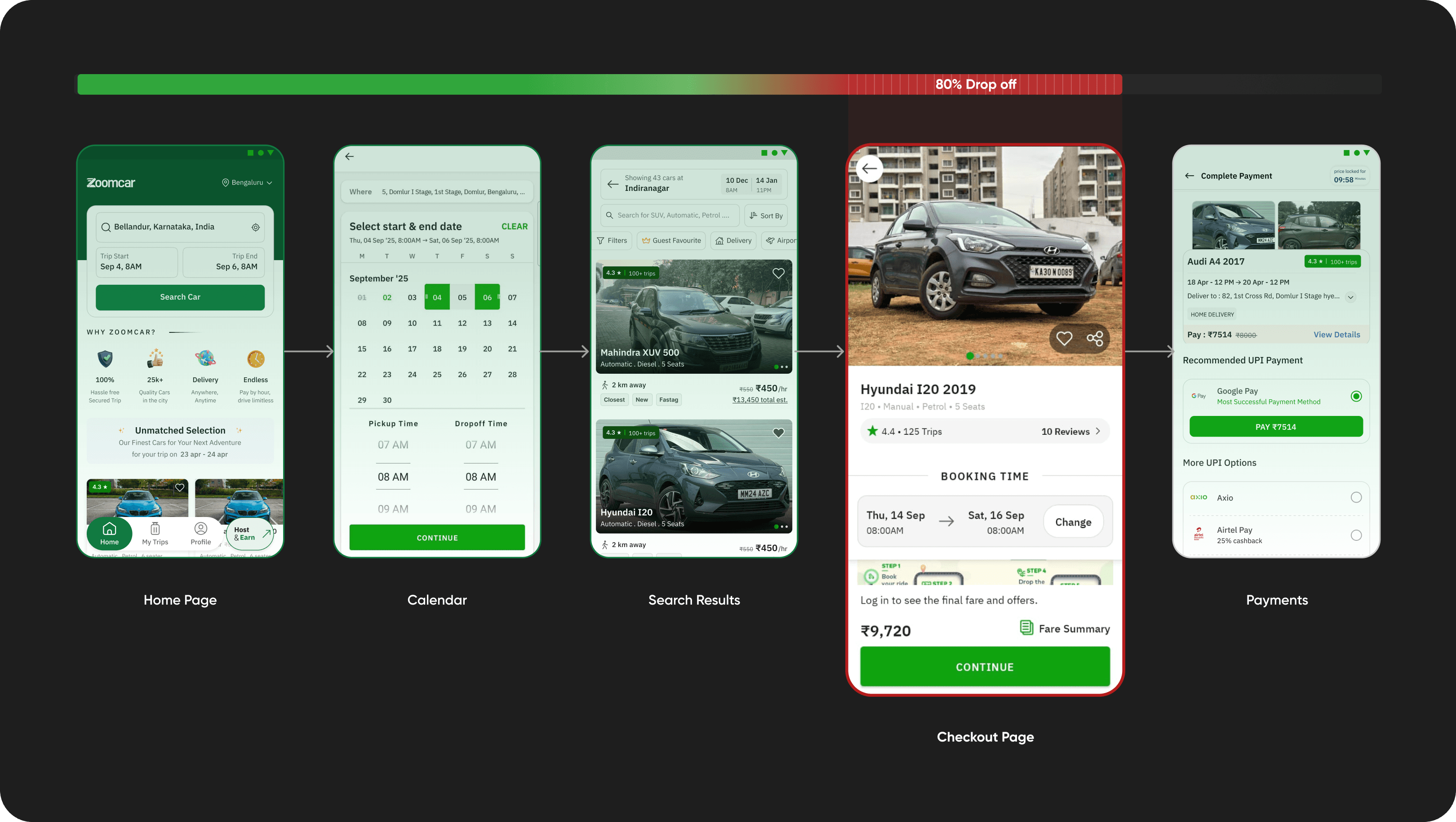 While booking a car on zoomcar, a user sets their location, picks their dates, chooses a car and lands on checkout.