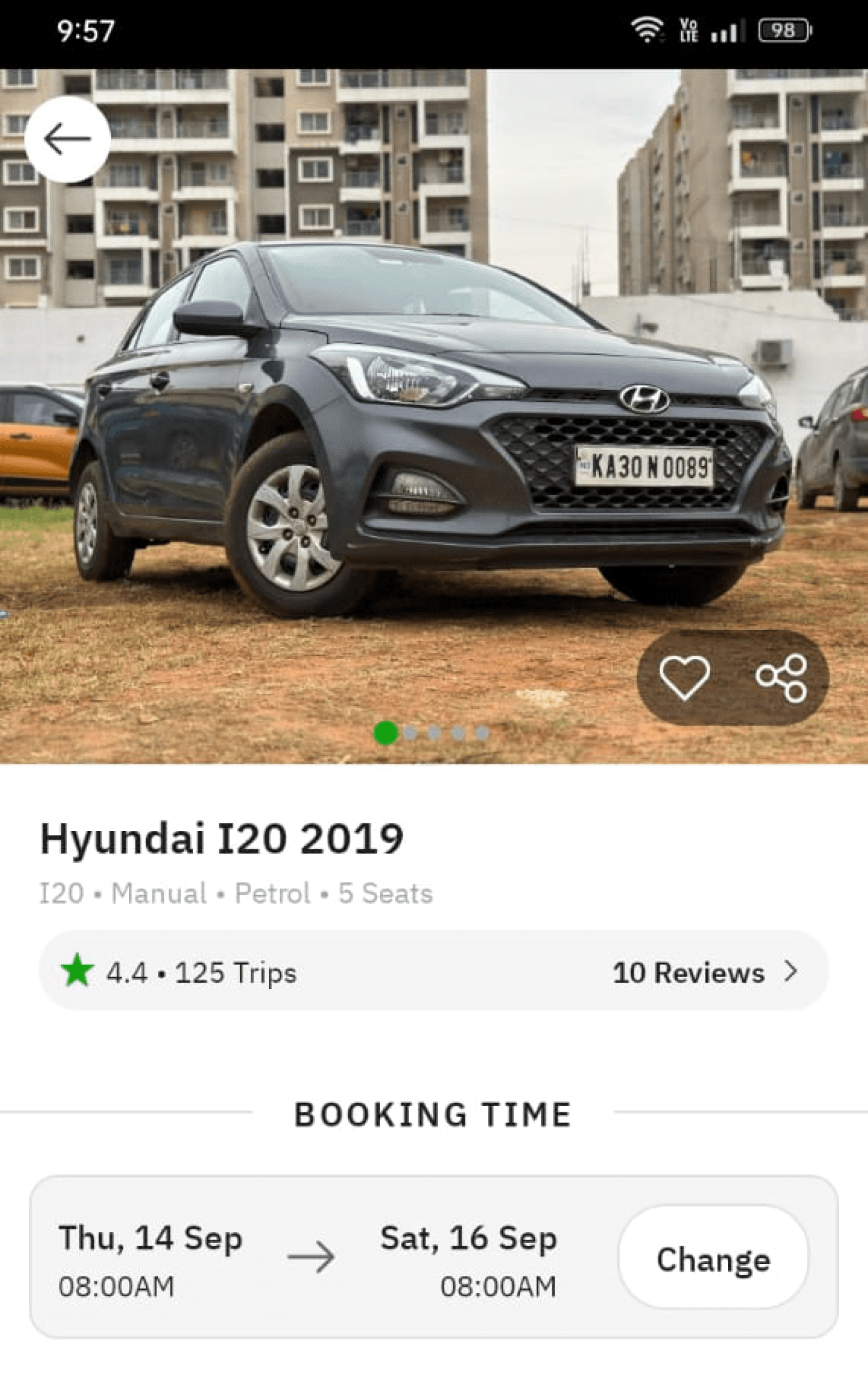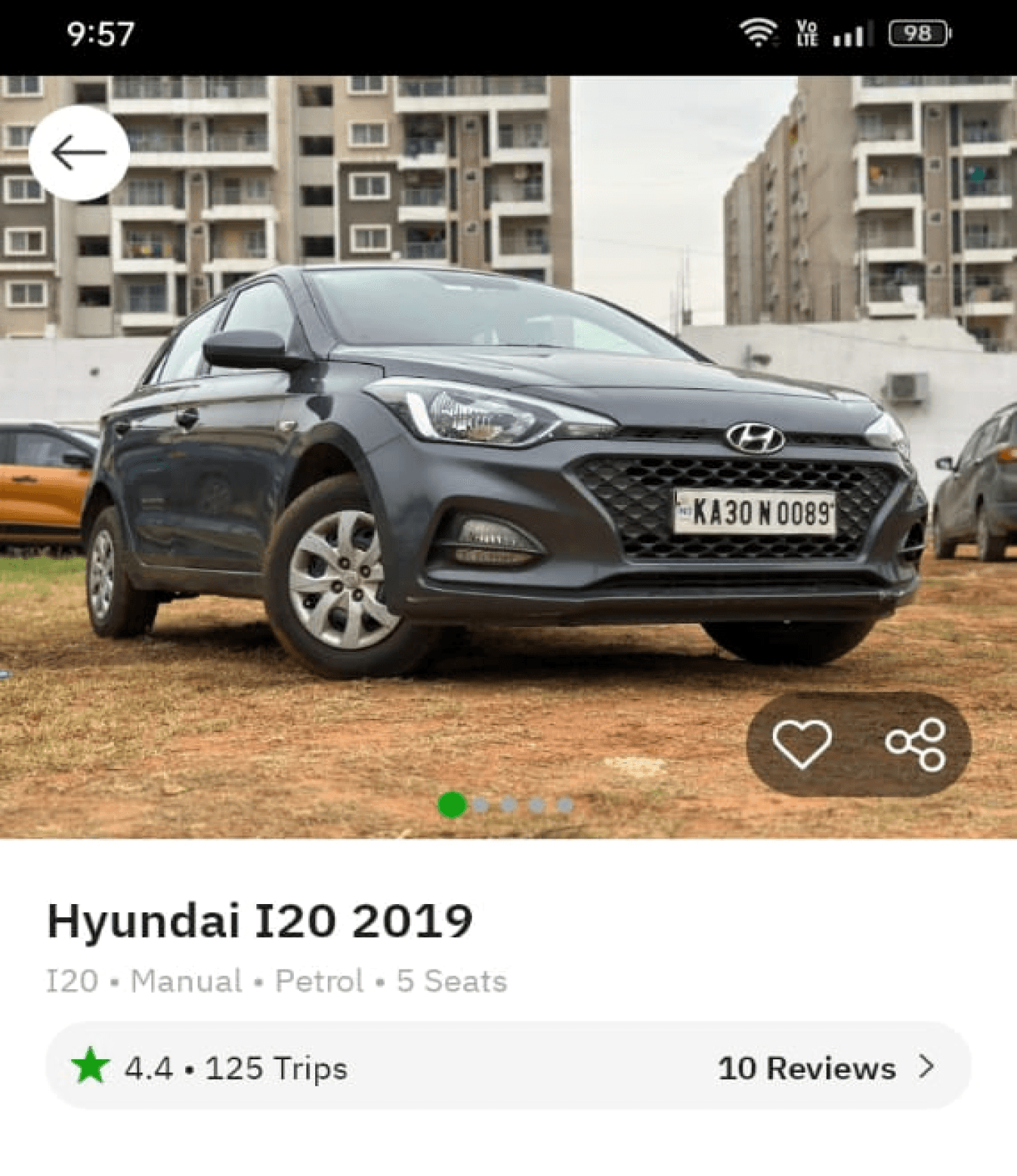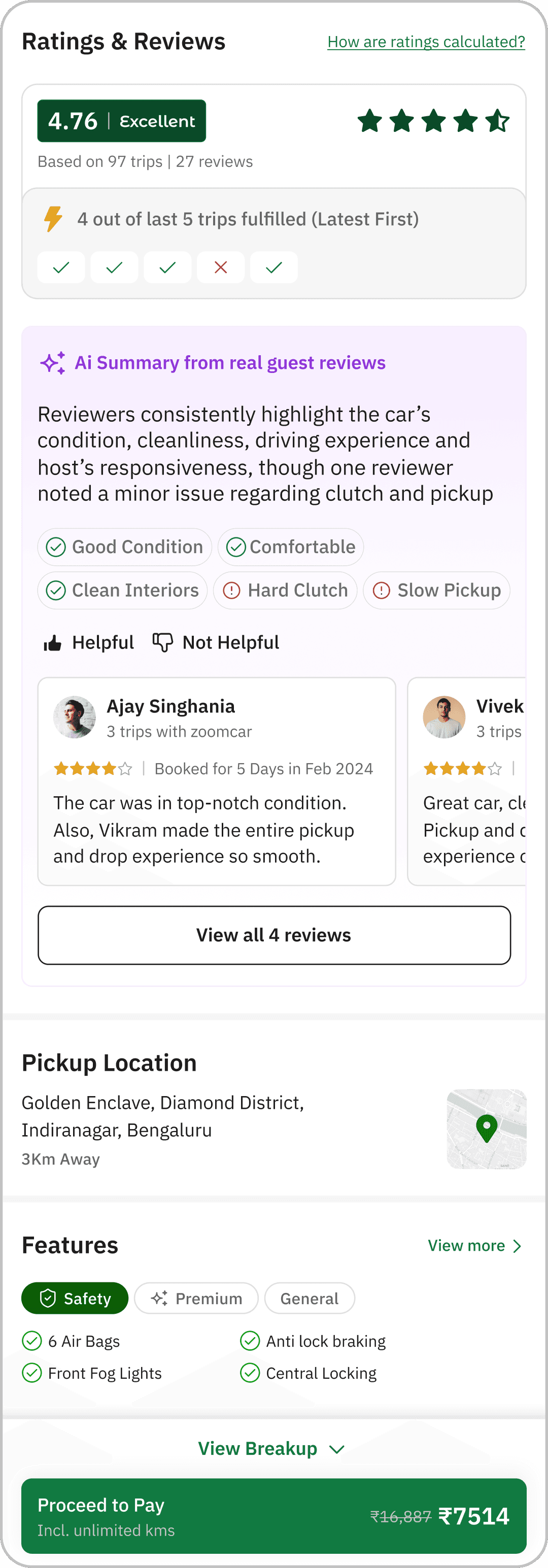 Car image dominates the first fold, limiting space for key trip info & ratings. Lacks focus on key decision-making info.