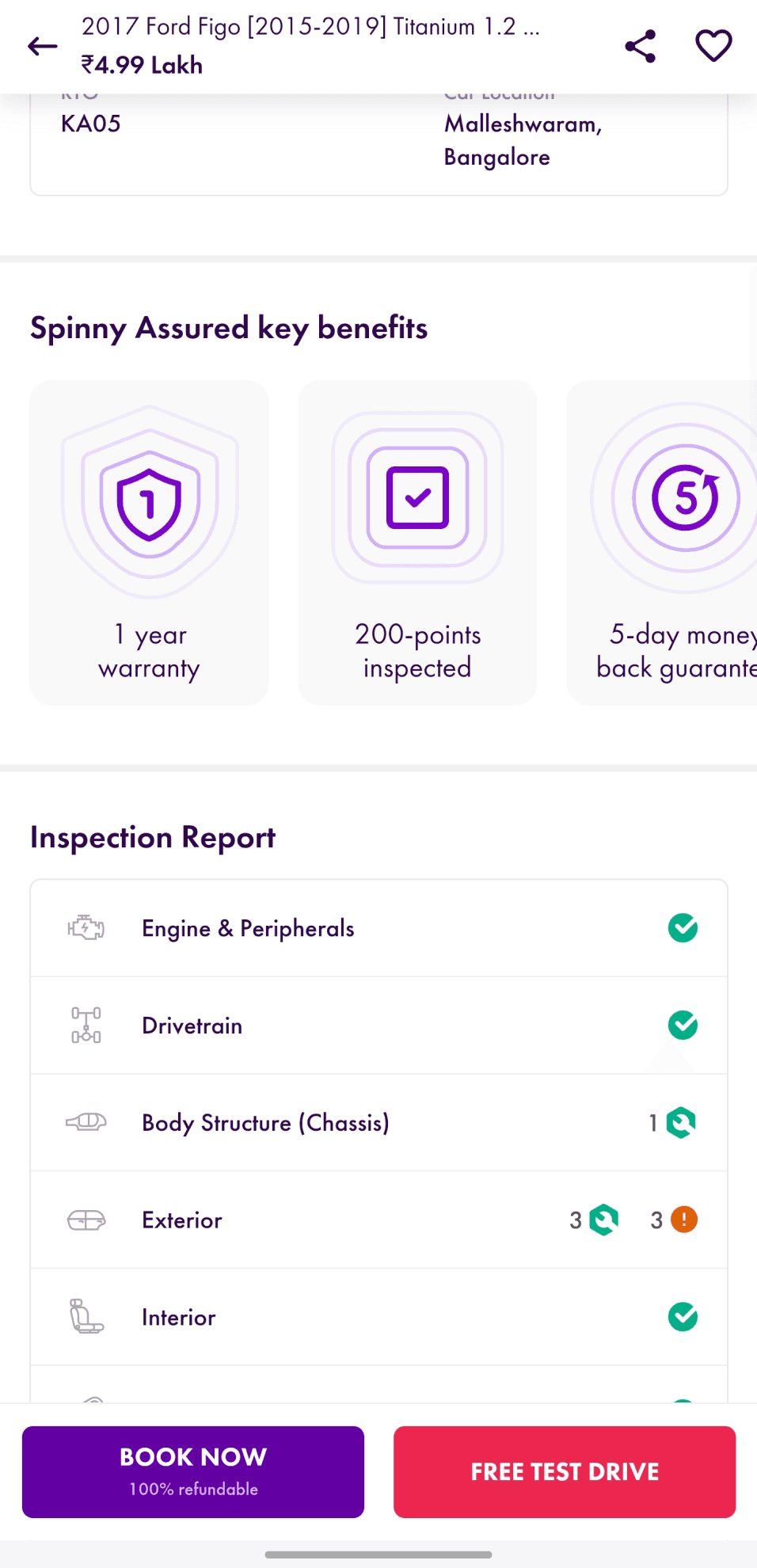 Introduce a car health section showing inspection data (engine, brakes, tyres, etc.) to promote quality inventory