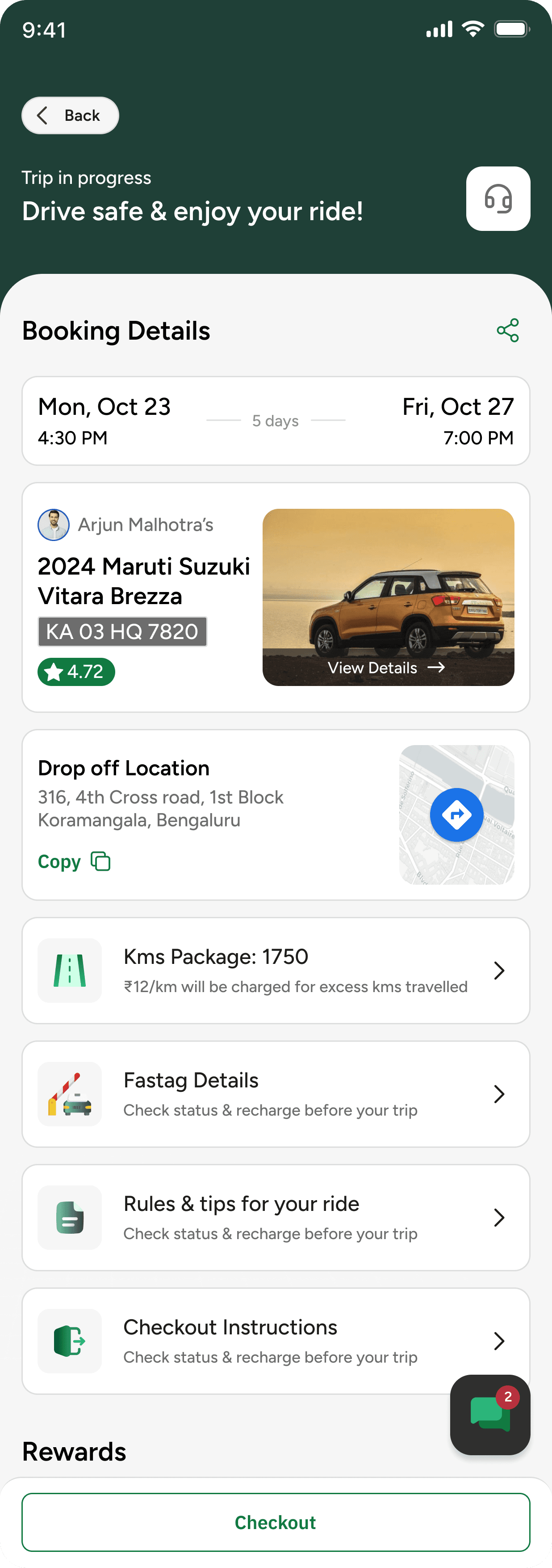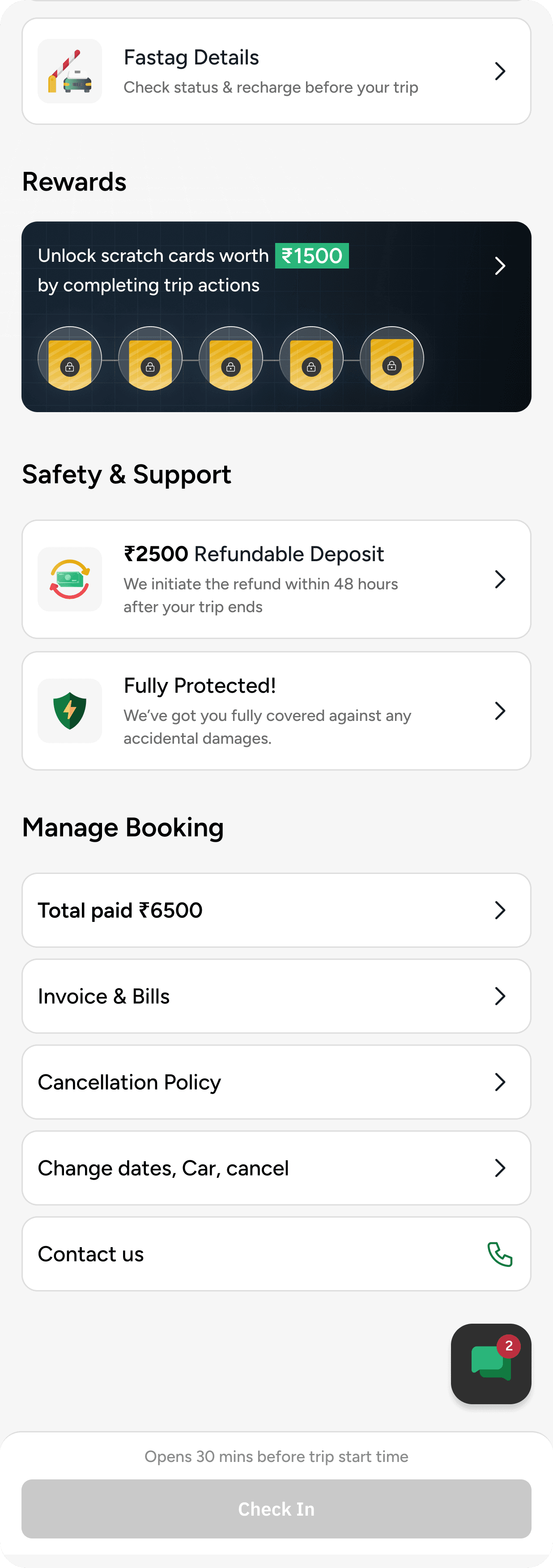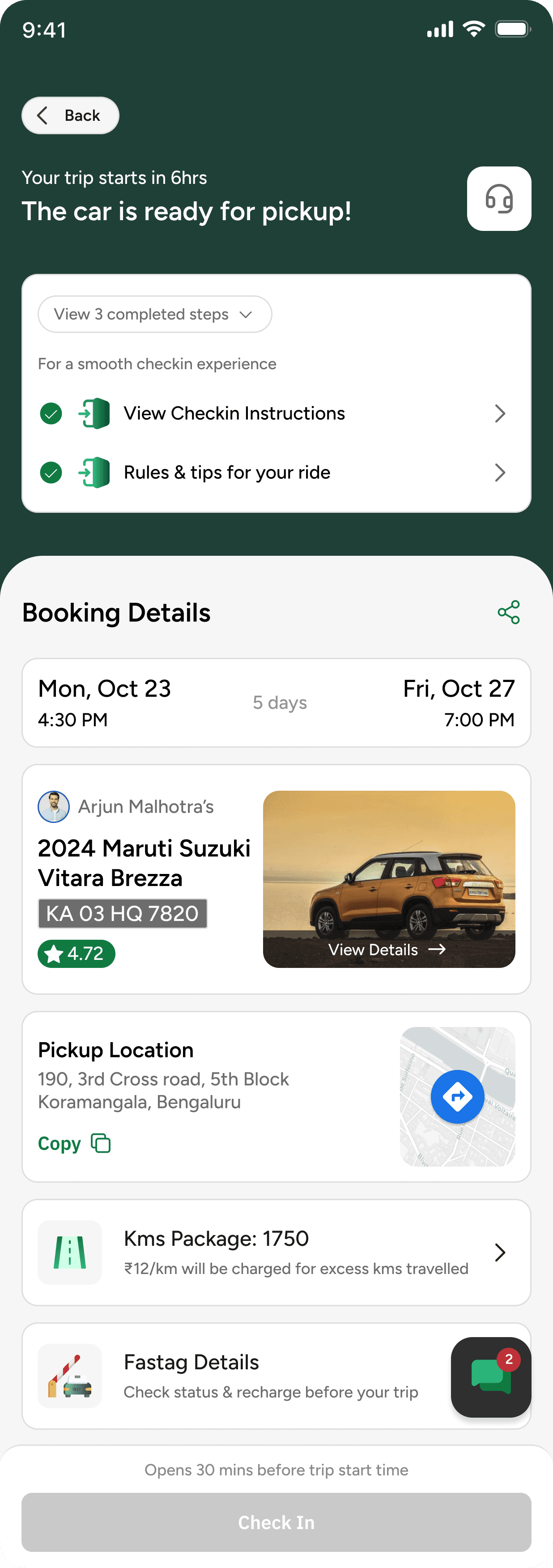 As users complete steps, the page transforms, Pickup location unlocks with copy and maps. FASTag and trip details surface. Rewards appear to drive engagement. The entire page adapts to user progress, not just the checklist.