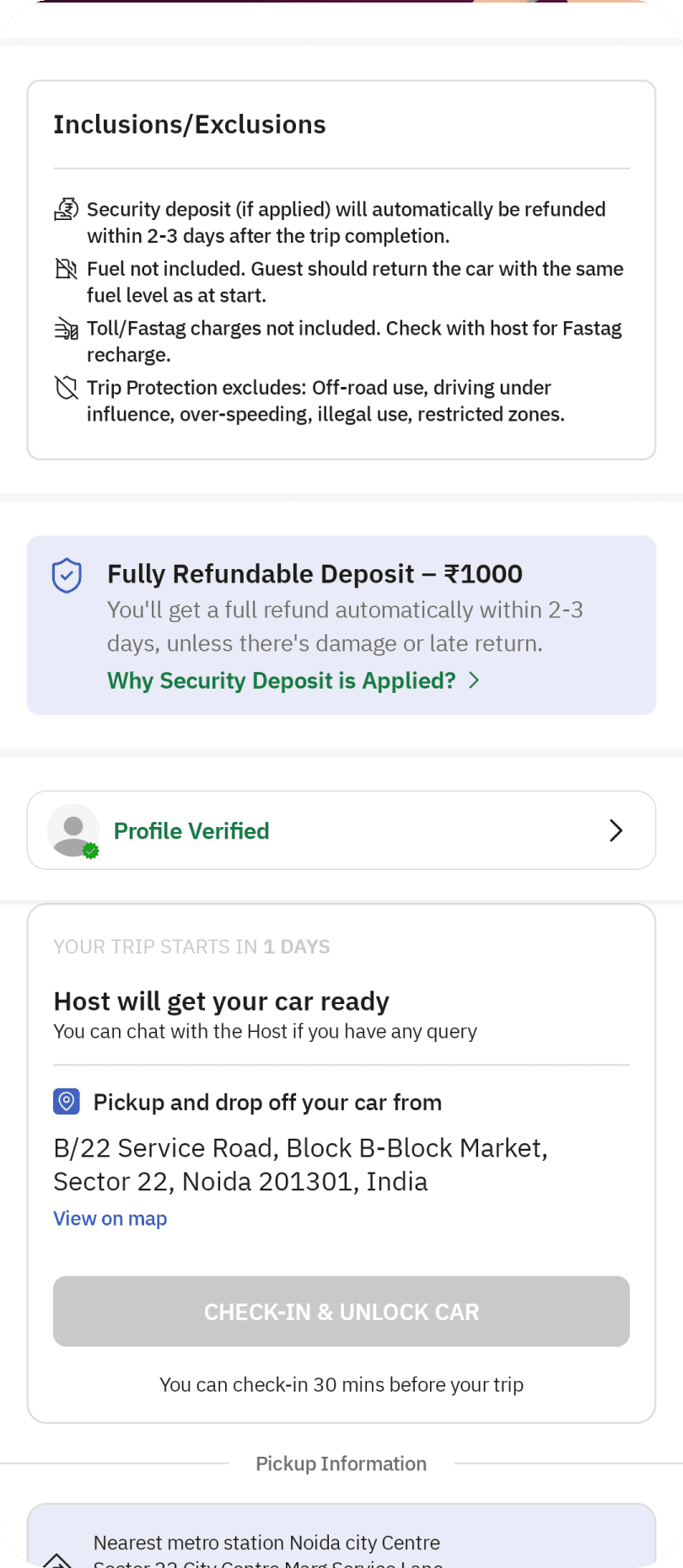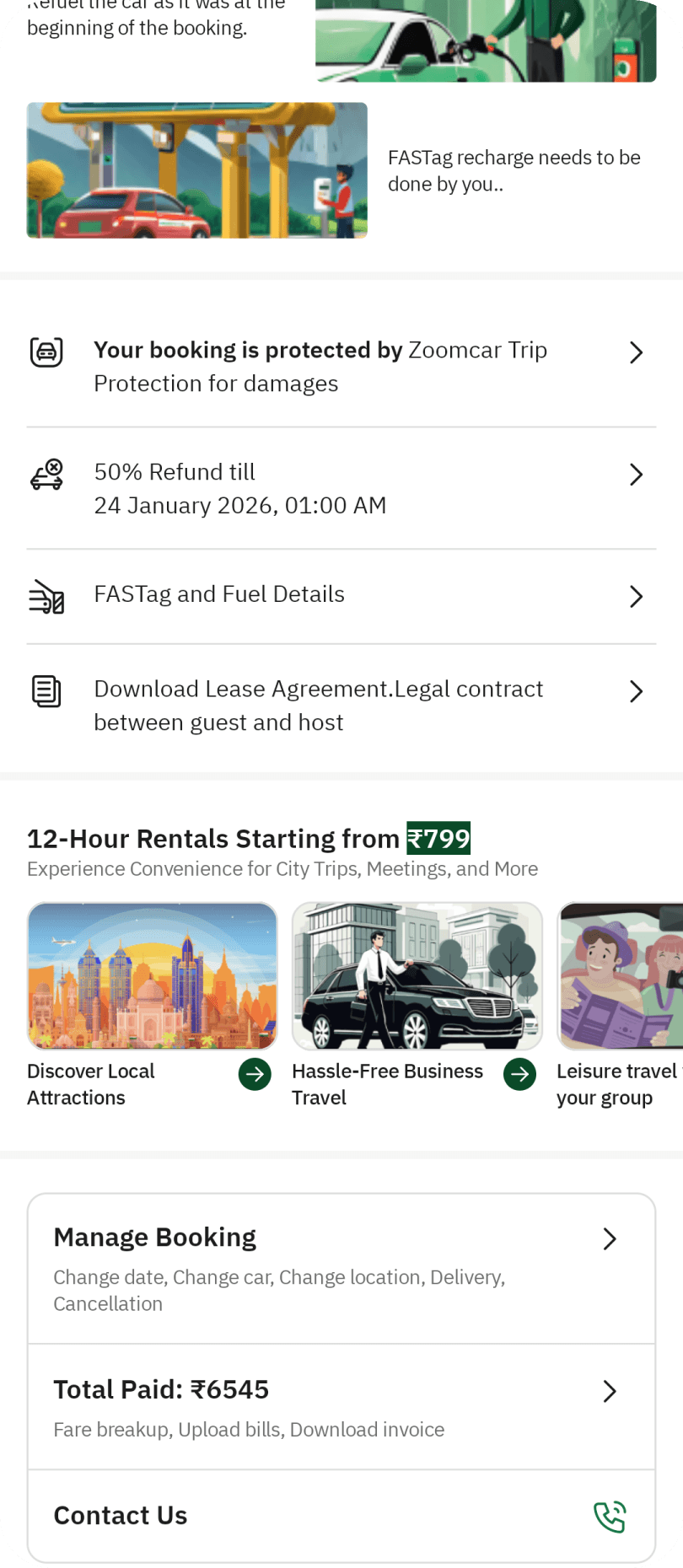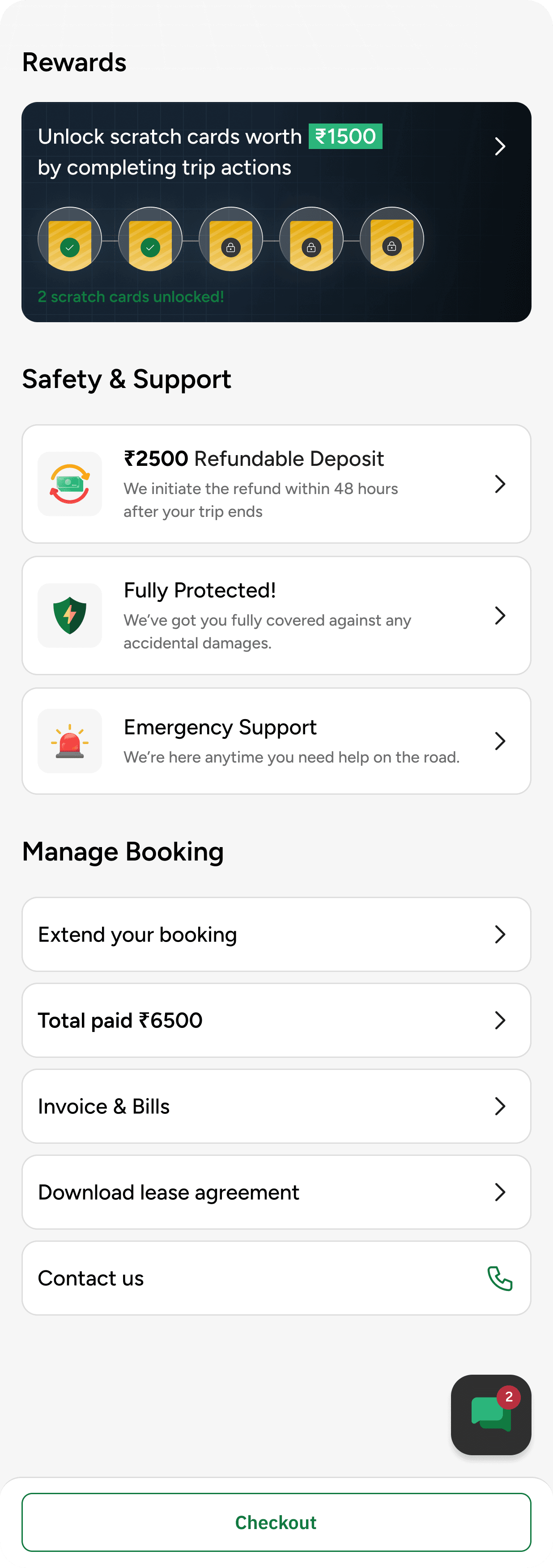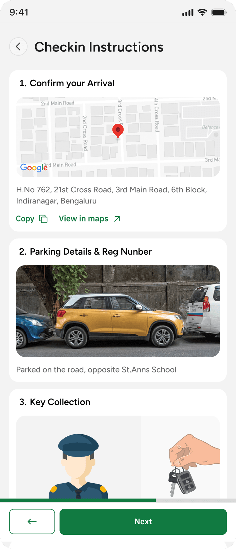 As users complete steps, the page transforms, Pickup location unlocks with copy and maps. FASTag and trip details surface. Rewards appear to drive engagement. The entire page adapts to user progress, not just the checklist.