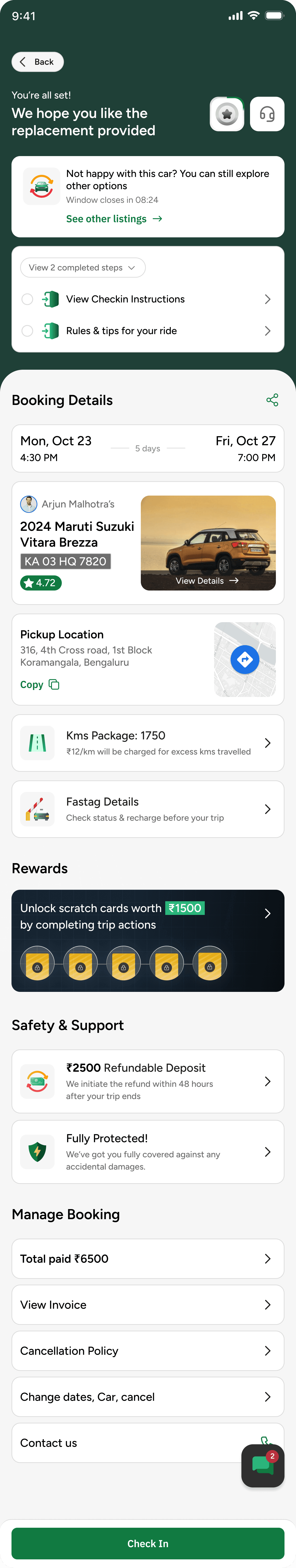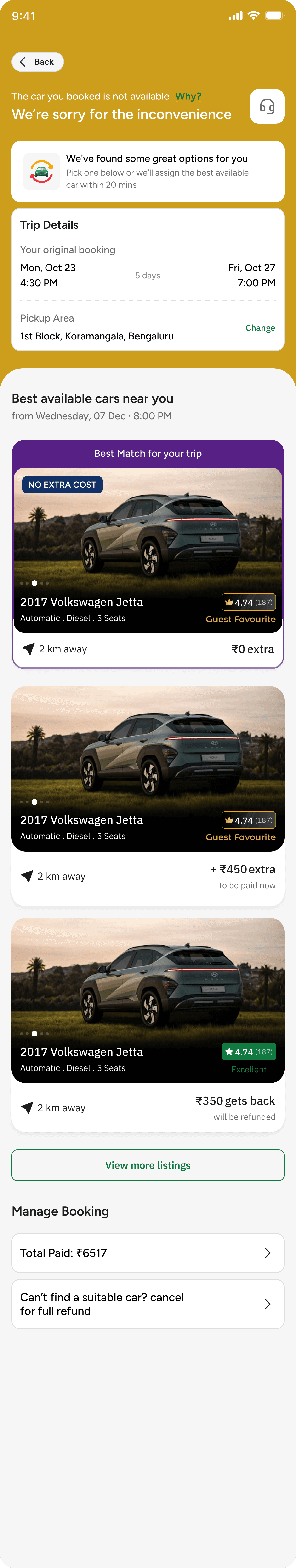 We redesigned the experience to start with empathy and context. The page explains what happened, lets users change their pickup location to find nearby cars if they're already on the move, and shows the top 3 replacement options with transparent details. If the user doesn't choose within 20 minutes, the best available car is auto-allocated, ensuring their plans aren't disrupted. Also with a flexibility to change the car if they are not satisfied with the auto replacement