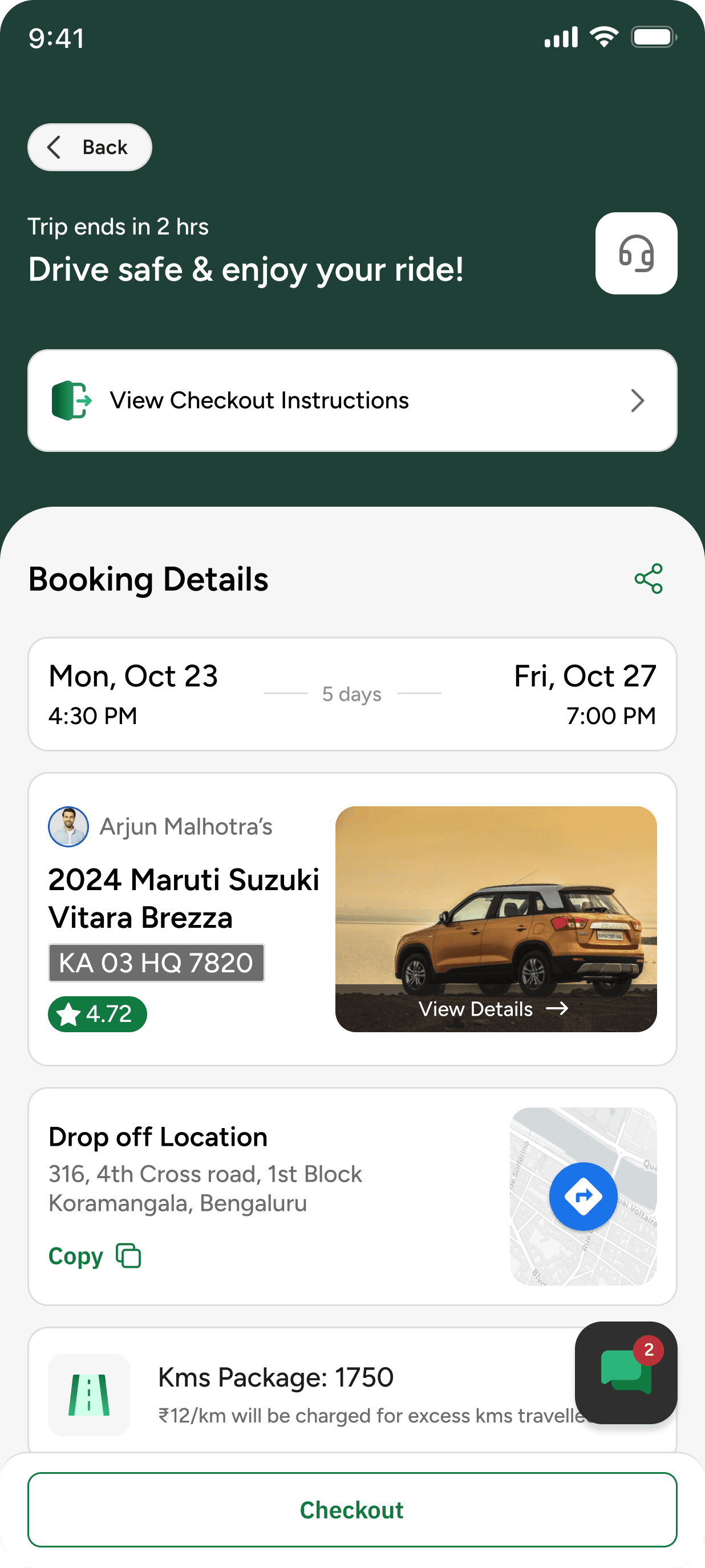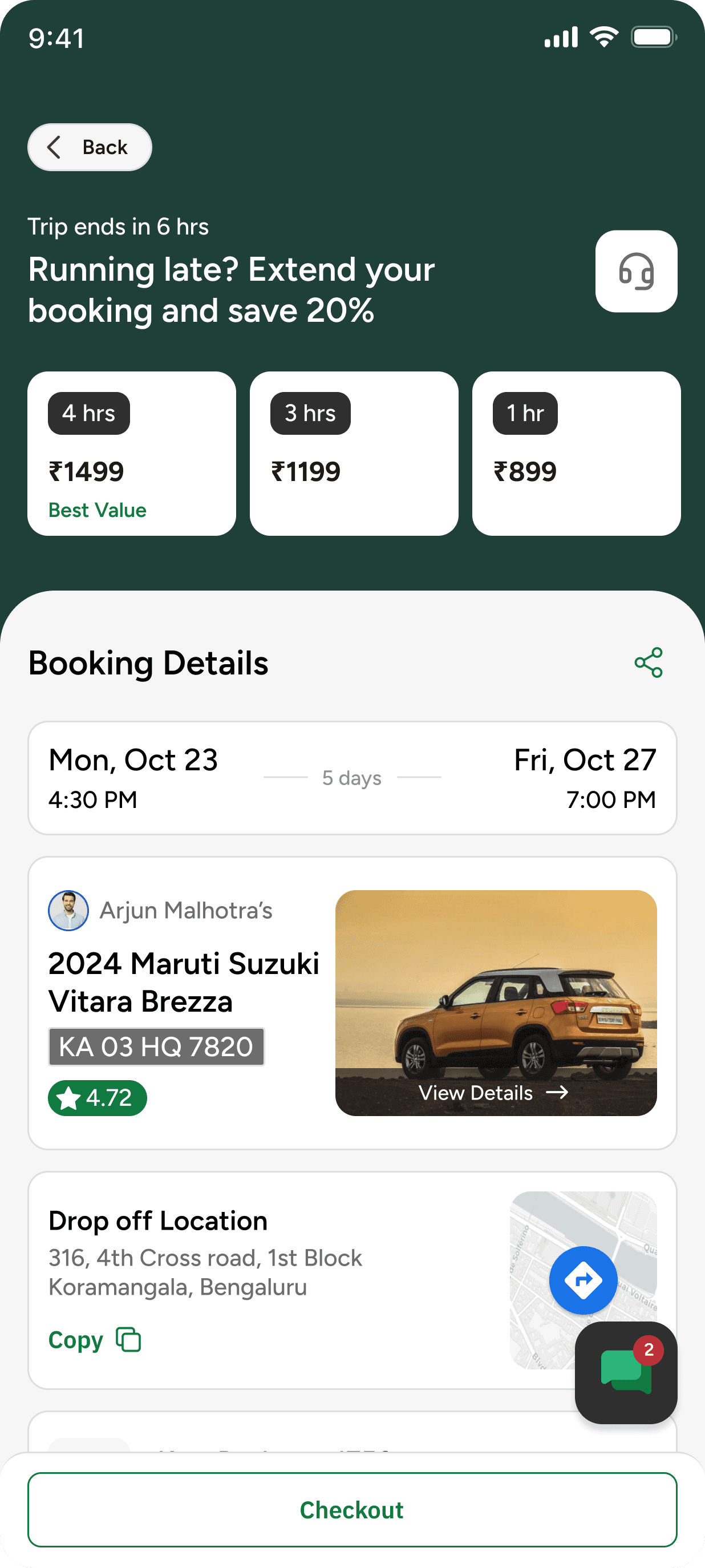 As trip end approaches, Action centre shows extension options few hours before return & Checkout instructions resurface at 2 hours before end time to help user prepare