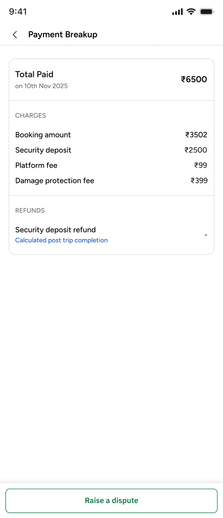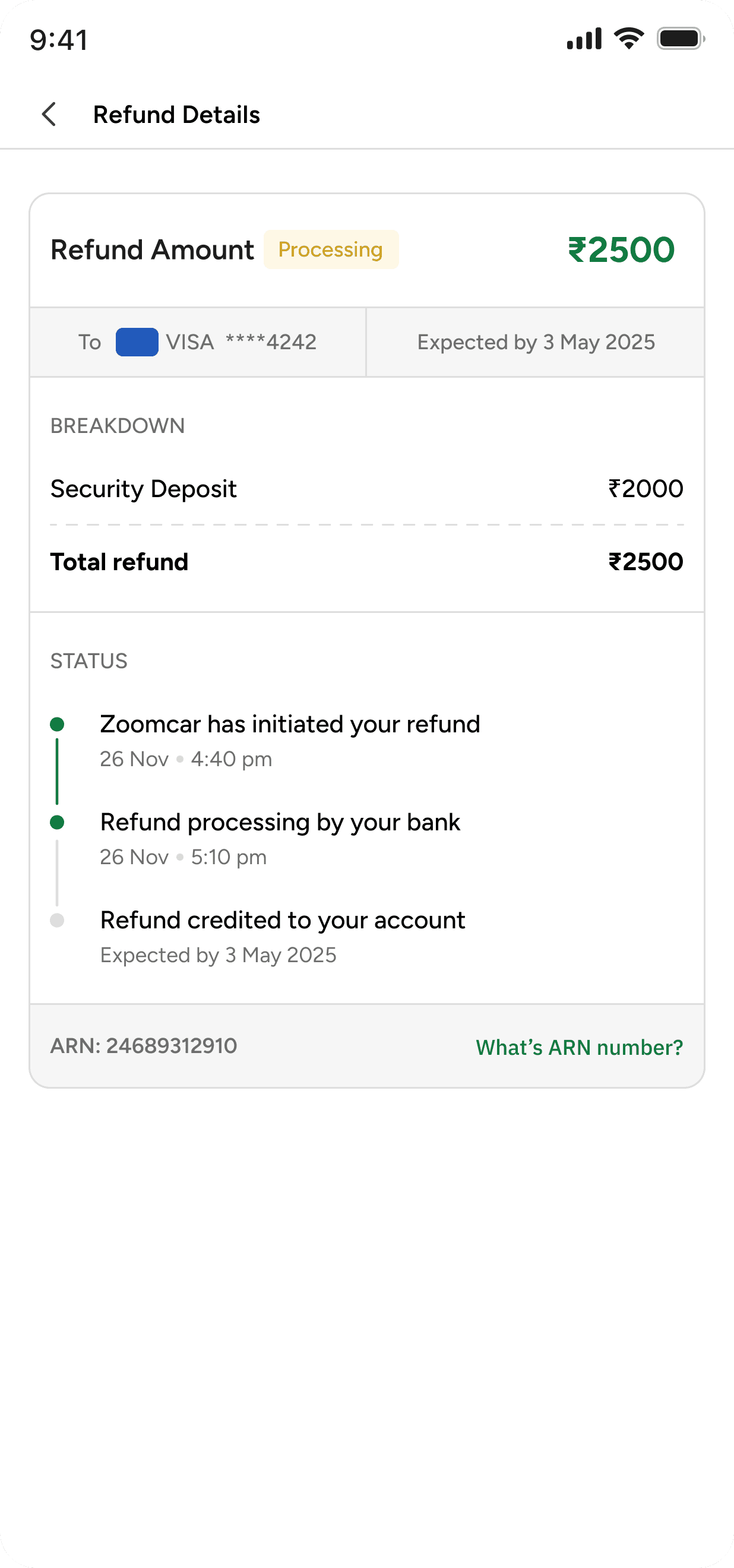 The refund section surfaces complete transparency upfront, with full breakdowns, timelines, deduction explanations, and dispute paths. Users see exactly what they're getting back and when, with no confusion.